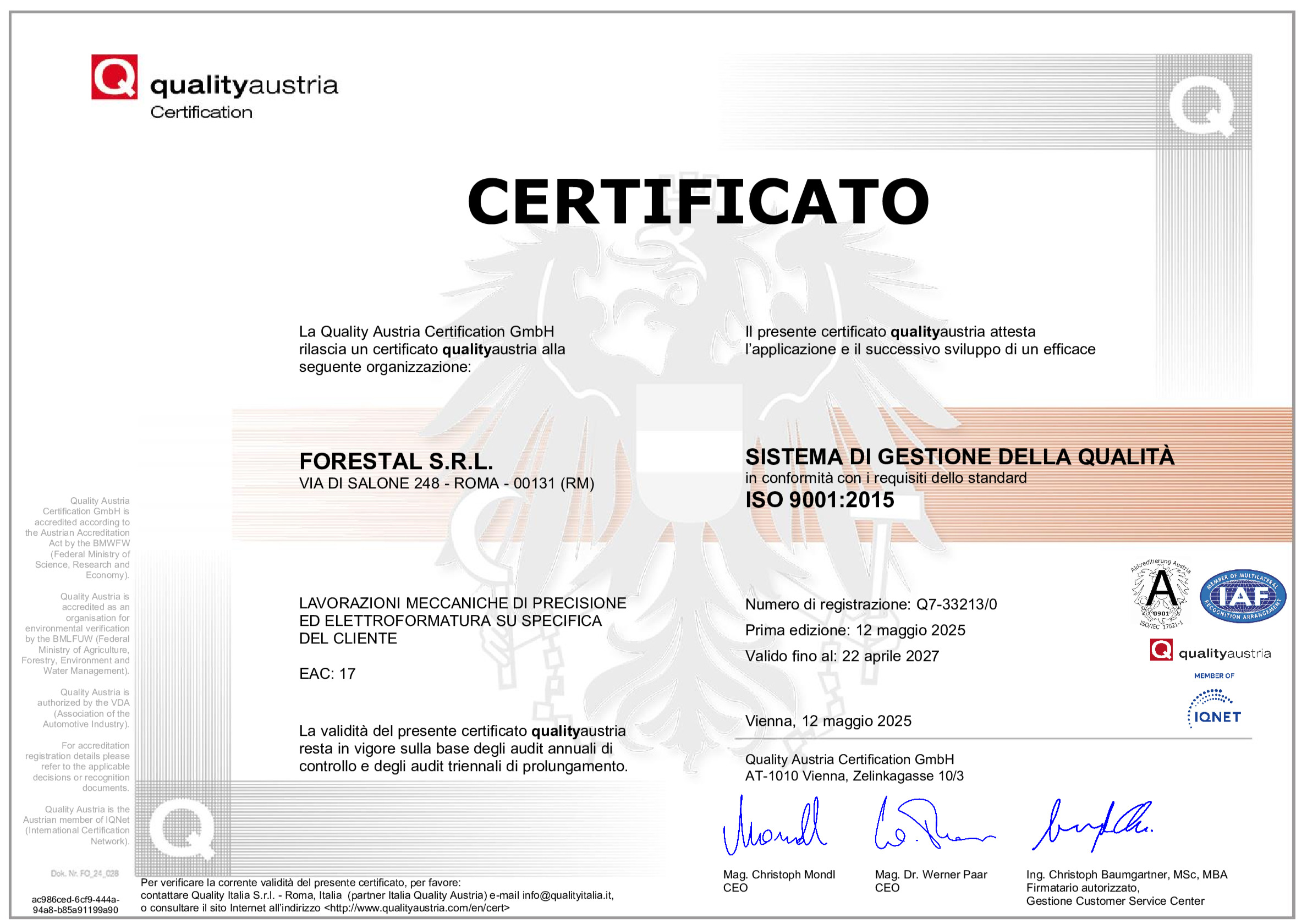 Soggetto al continuo e soddisfacente mantenimento del sistema di gestione questo certificato è valido fino al 22 Aprile 2027